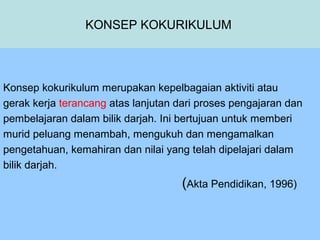 Kokurikulum ialah aktiviti pendidikan yang dirancang dan diperlaksanakan selepas waktu pelajaran formal di dalam dan di luar bilik darjah berasas dan lanjutan pelajaran sesi persekolahan. DASAR PELAKSANAAN KOKURIKULUM terkandung dalam DASAR PELAJARAN NEGARA 1956 PENYATA RAZAK 1956 ORDINANCE PELAJARAN 19521957 LAPORAN RAHMAN TALIB 1957 AKTA PELAJARAN 1961 FALSAFAH PENDIDIKAN KEBANGSAAN 1988. Definisi berkaitan pengurusan Kokurikulum 4 3.