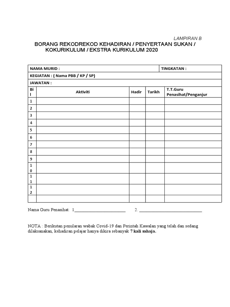 Borang Kehadiran Aktiviti Kokurikulum Pdf