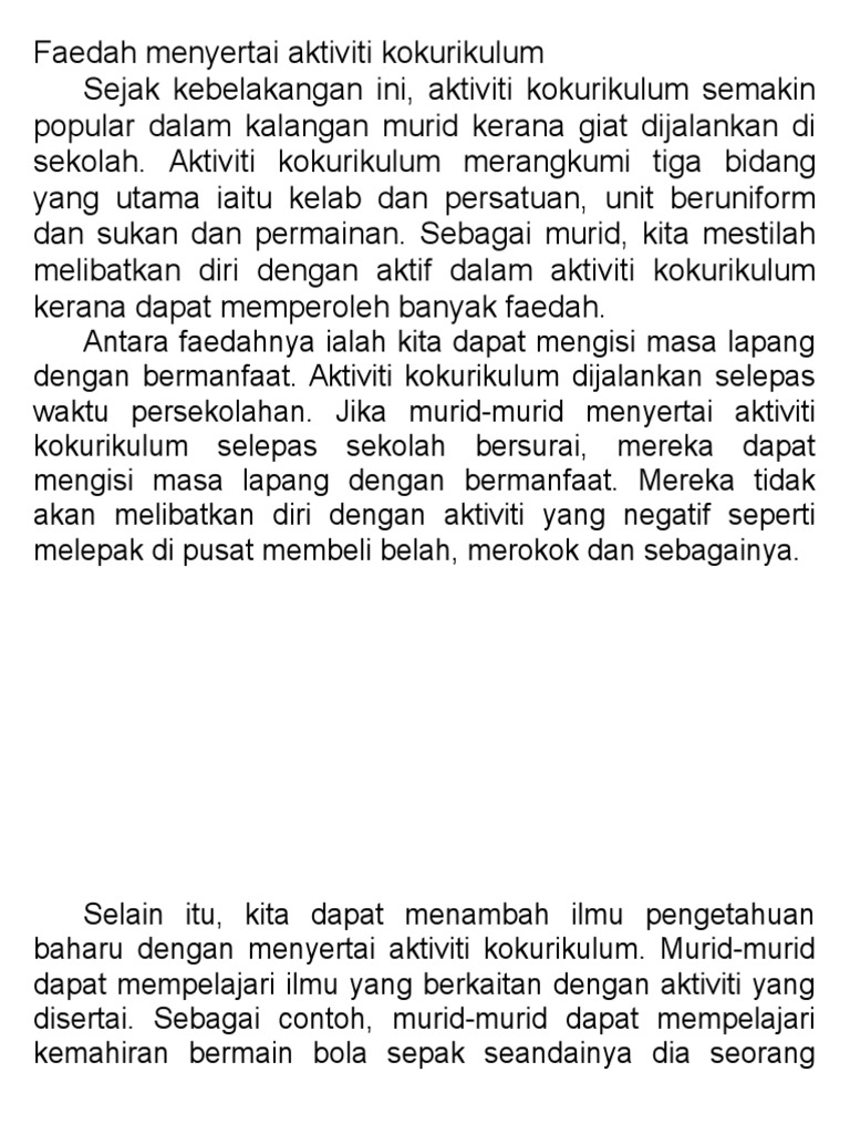 Oleh itu kegiatan kokurikulum dapat mengisi masa lapang dengan berfaedah. 642 Contoh aktiviti yang berkaitan dengan pandangan dan pengetahuan bidang kerjaya. Hal ini akan menyebabkan kita terpaksa menanggung kos perbelanjaan yang besar karangan faedah menyertai aktiviti kokurikulum.