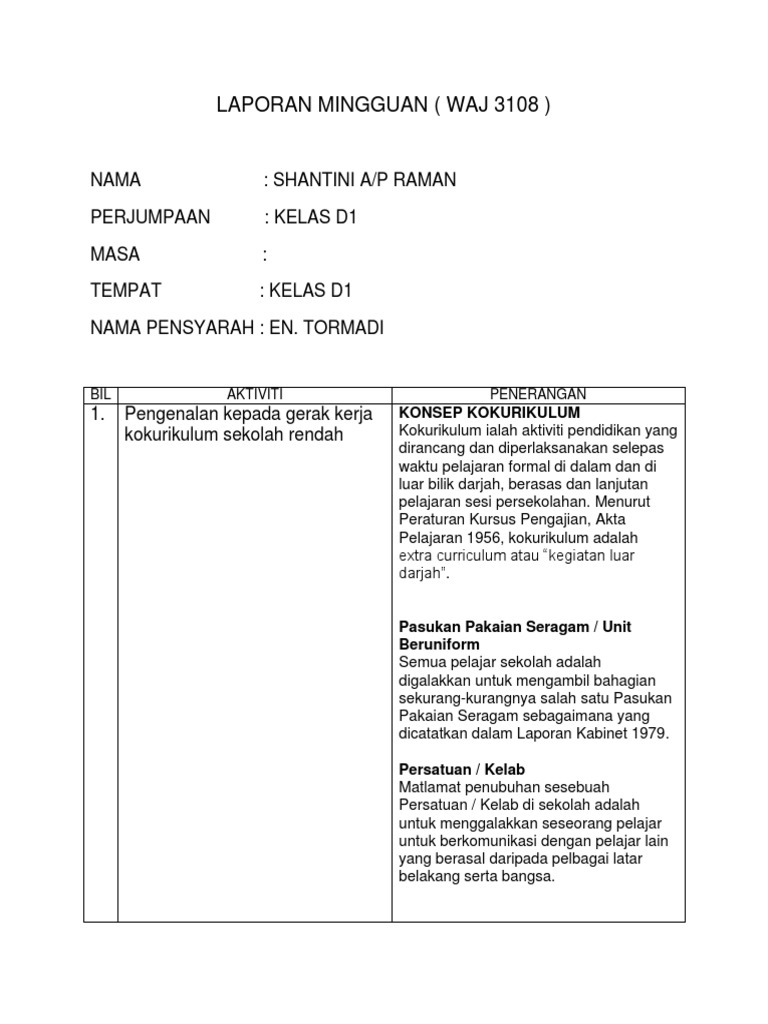 Contoh Laporan Aktiviti Kokurikulum Sekolah Setiap guru penasihat bagi persatuan kelab badan beruniform dan sukan di sekolah perlu membuat laporan untuk setiap aktiviti kokurikulum yang telah dijalankan. Rekod pengajaran berpasangan 8. Kokurikulum ialah aktiviti di luar kelas.