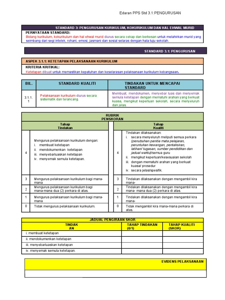 PENGURUSAN KURIKULUM ASPEKTUMS NAMA ASPEKSTANDARD KUALITI MUKA SURAT PPS 311 KETETAPAN PELAKSANAAN KURIKULUM 3111 Pelaksanaan kurikulum diurus secara sistematik dan terancang. KETETAPAN DASAR KURIKULUM. Rujukan KPM100-1 96 Jilid 2 56 bertarikh 16 November 2021.