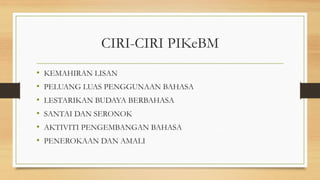 Pelaksanaan ini melibatkan Prasekolah Sekolah Rendah dan Menengah. PIKeBM. PIKeBM melalui aktiviti kokurikulum mendedahkan murid kepada kemahiran lisan bahasa Melayu dan memberikan peluang yang luas kepada mereka.