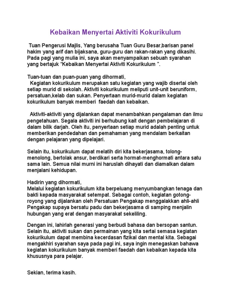 Kamu telah menyertai satu pertandingan syarahan peringkat sekolahtajuk syarahan itu ialah kebaikan mengikuti aktiviti kokurikulum. Berikut dikongsikan contoh karangan yang bertajuk Faedah Menyertai Kegiatan Kokurikulum Di Sekolah. Faedah Menyertai Aktiviti Kokurikulum.