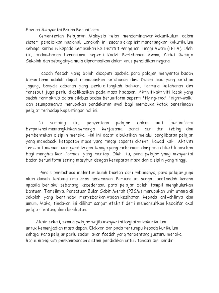 Aktiviti Badan Beruniform Serta Faedahnya Karangan. Membentuk sifat jati diri- Sikap ini penting untuk menyediakan kita menghadapi dunia luar apabila menamatkan SPM dan alam persekolahan. Karangan spm kebaikan menyertai kegiatan kokurikulum di sekolah.