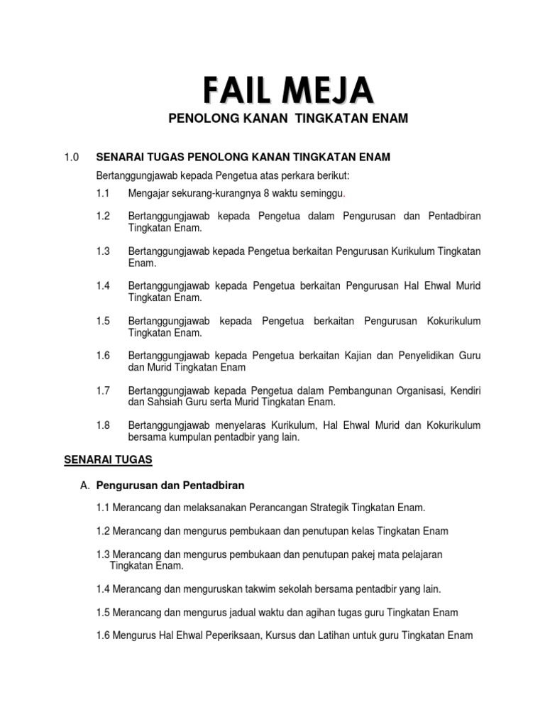Fail meja gpk kokurikulum. 38 Proses Kerja Guru Penolong Kanan Kokurikulum. Manual Prosedur Kerja dan Fail Meja ini berfungsi untuk meningkatkan kecekapan dan keberkesanan sesebuah jabatan dan juga individu. Manual Prosedur Kerja dan Fail Meja ini berfungsi untuk meningkatkan kecekapan dan keberkesanan sesebuah jabatan dan juga individu.