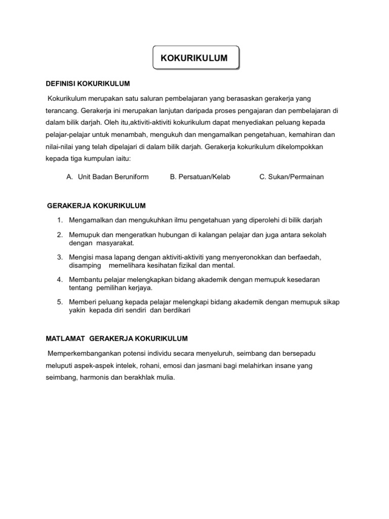 View Keperluan_Aktiviti_Kokurikulumpdf from MATH 238 at Sekolah Menengah Kebangsaan Mahmud. Faedah menyertai aktiviti kokurikulum kepada para pelajar pendahuluan aktiviti di luar bilik darjah badan beruniform kelab persatuan serta sukan. SURAT PEMBERITAHUAN AKTIVITI KOKURIKULUM KEPADA IBU BAPAPENJAGA.