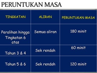 Ianya selaras dengan inspirasi negara sepertimana yang terkandung di dalam Pelan Pembangunan Pendidikan Malaysia PPPM 2013-2015. 5652 telah membuat ketetapan pembahagian masa untuk Kokurikulum seperti. Dasar Utama 5 Penyertaan Beramai-Ramai.