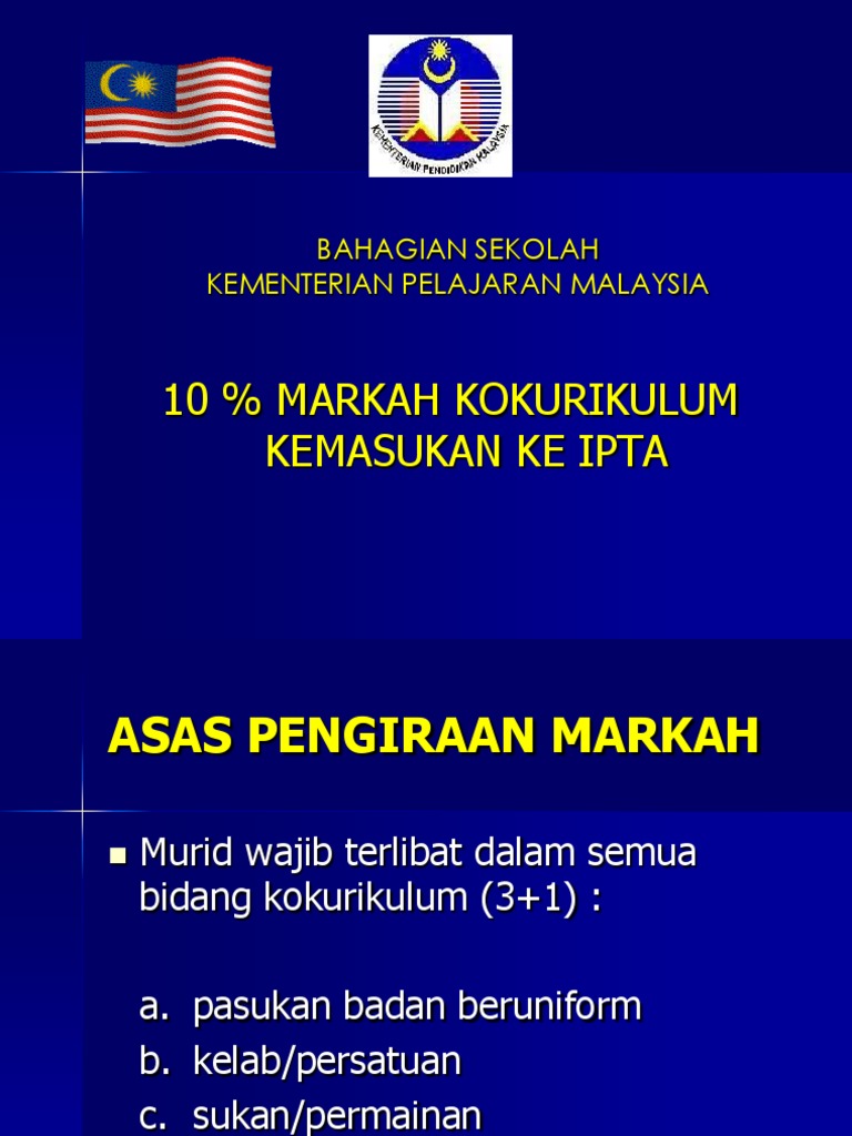 10 markah Kokurikulum masuk IPTA Pemilihan kemasukan pelajar ke institusi pengajian tinggi awam IPTA bagi program pengajian lepasan Sijil Tinggi Persekolahan Malaysia STPM Matrikulasi dan Sijil Pelajaran Malaysia SPM adalah berasaskan 90 peratus markah akademik dan 10 peratus markah kokurikulum. Panduan pemarkahan format pajsk sekolah rendah dan sekolah menengah. Sebuah sistem telah diperkenalkan iaitu PAJSK bagi memudahkan untuk membuat pentaksiran yang diambil oleh semua pelajar sekolah rendah mahupun di bawah.