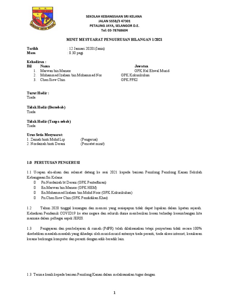 Mesyuarat Pengurusan Bil 1 2021 Pdf
