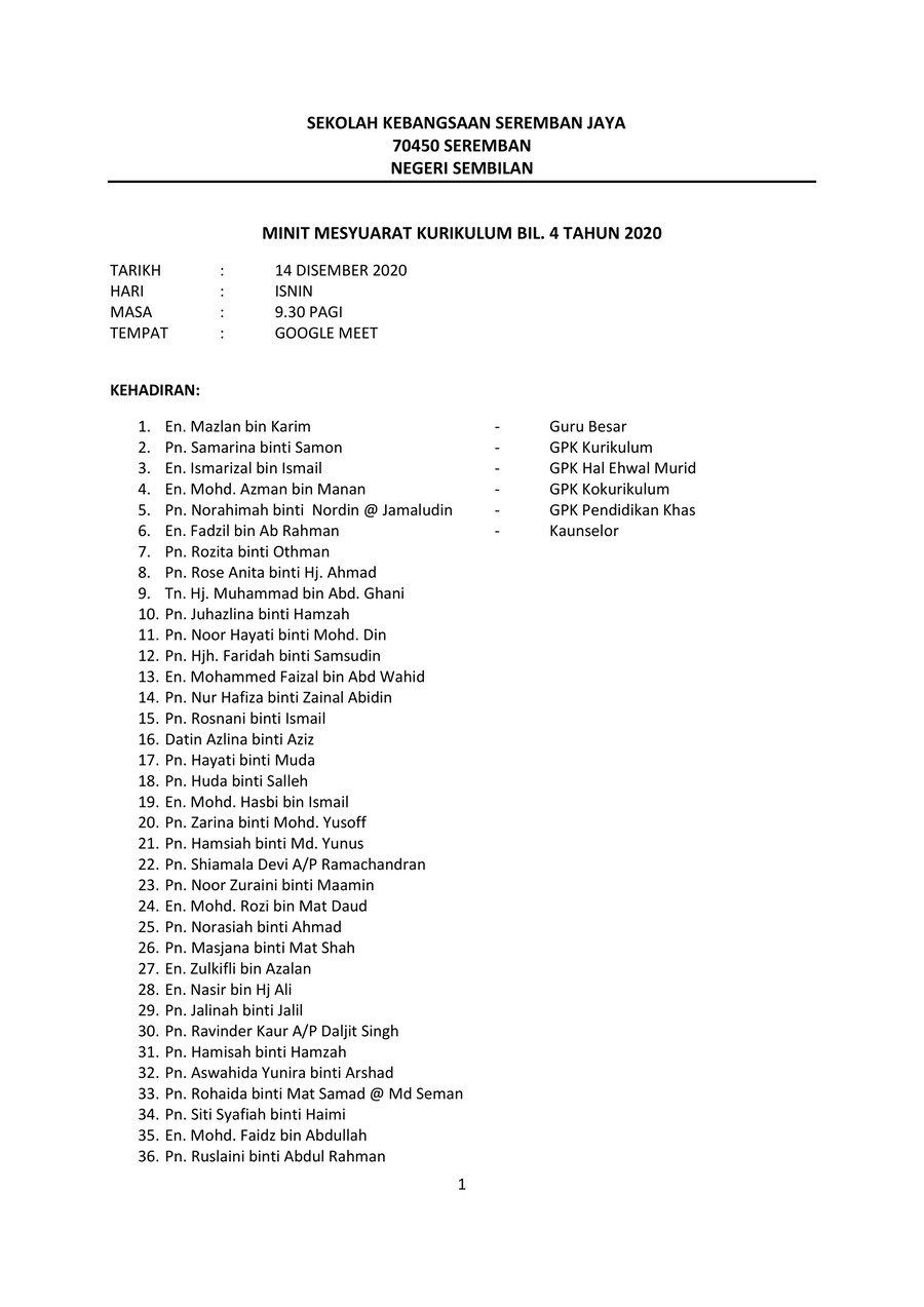 SMK SERI KUNDANG 48020 RAWANG SELANGOR MINIT MESYUARAT INDUK KURIKULUM Bil 12021 Tarikh Masa Tempat. 40 PENGESAHAN MINIT MESYUARAT YANG LALU BIL. Minit mesyuarat atau minutes of meeting mom adalah penting dalam sesebuah mesyuarat kerana ia akan menjadi panduan dan rujukan buat pekerja dan orang yang.