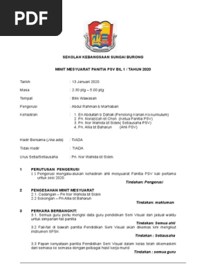 MINIT MESYUARAT KOKURIKULUM BIL 1 TAHUN 2019 Tarikh. MESYUARAT KOKURIKULUM BIL 1 TAHUN 2020 was published by siti radziana yop on 2019-12-30. 20 Full PDFs related to this paper.