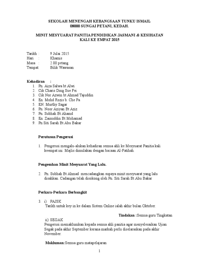 Minit Mesyuarat Panitia Pjk Kali Ke 4 2015 Pdf