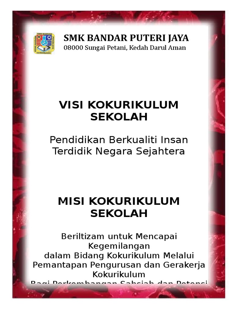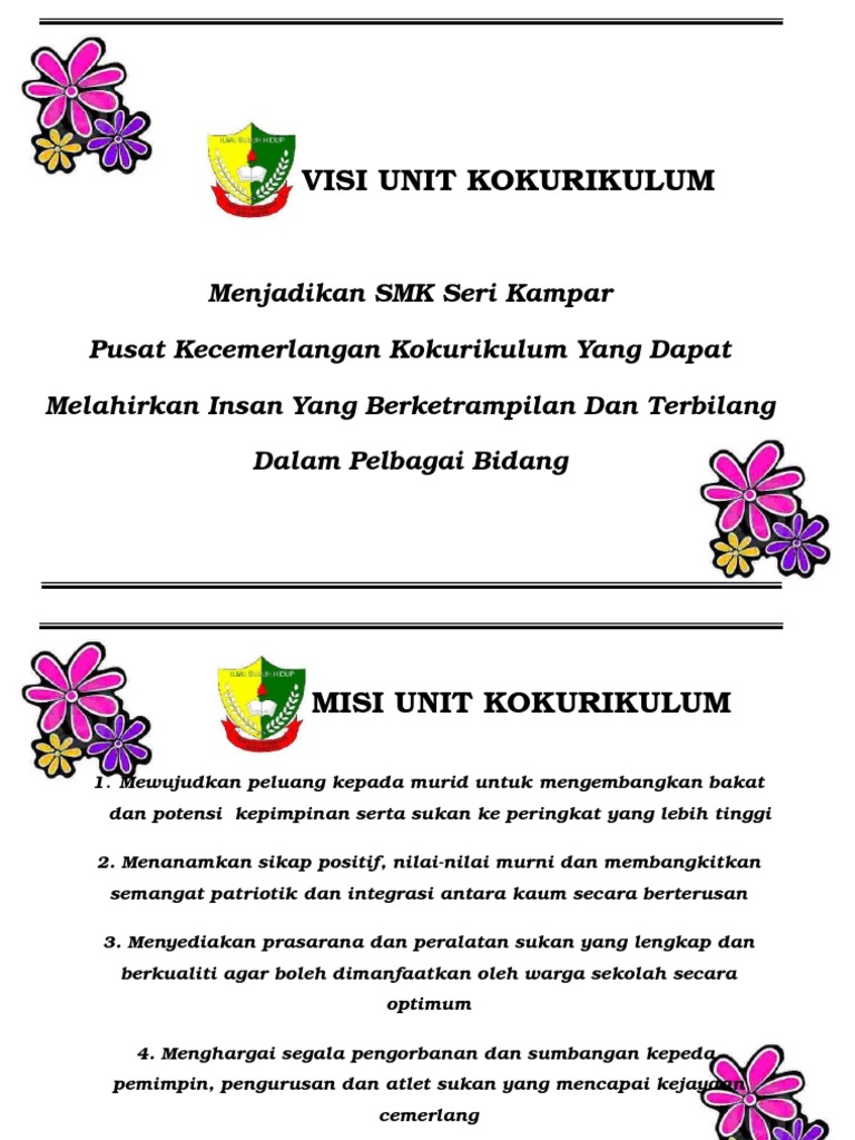 Mengenai Unit Takwim Aktiviti Kokurikulum. Aktiviti kokurikulum SMK Padang Temu adalah kesinambungan daripada proses pengajaran dan pembelajaran dalam bilik darjah bagi melahirkan individu yang berketerampilan dalam semua aspek. Contoh visi dan misi sekolah dasar sd yang terbaik sesuai dengan kurikulum yang berlaku visi dan misi sd inpres maccini sombala 1 visi.