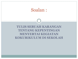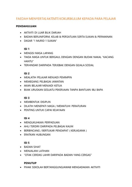 Kepentingan aktiviti kokurikulum Isi. Memang tidak dapat dinafikan bahawakegiatan kokurikulum sememangnya mendatangkan pelbagai faedah kepada pelajarAktiviti kokurikulum dapat menyihatkan tubuh badan pelajarAktiviti kokurikulum seperti 1M1S dapat menangani masalah obesiti dalam kalangan pelajarMelalui kegiatan kokurikulum yang dijalankanpelajar memerlukan. Selari dengan kepentingan aktiviti kokurikulum dalam sistem pendidikan kini guru-guru seharusnya melengkapkan diri dengan pengetahuan dan kemahiran dalam bidang kokurikulum bagi memupuk minat.
