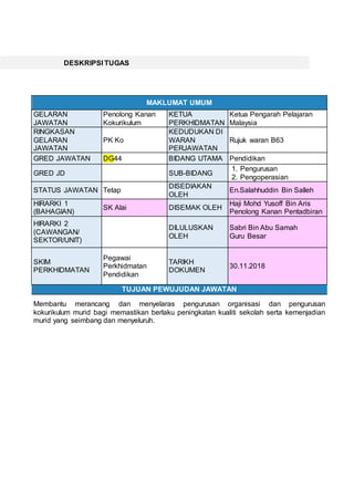 Akauntabiliti dan tugas utama boleh sama bagi jawatan yang menjalankan fungsi yang sama tetapi terdapat kemungkinan perbezaan pada komponen. CONTOH PENULISAN KEBERHASILAN - GPK KOKURIKULUM. Menjalankan tugas-tugas Guru Besar semasa ketiadaan Guru BesarPK Pentadbiran PK HEM.
